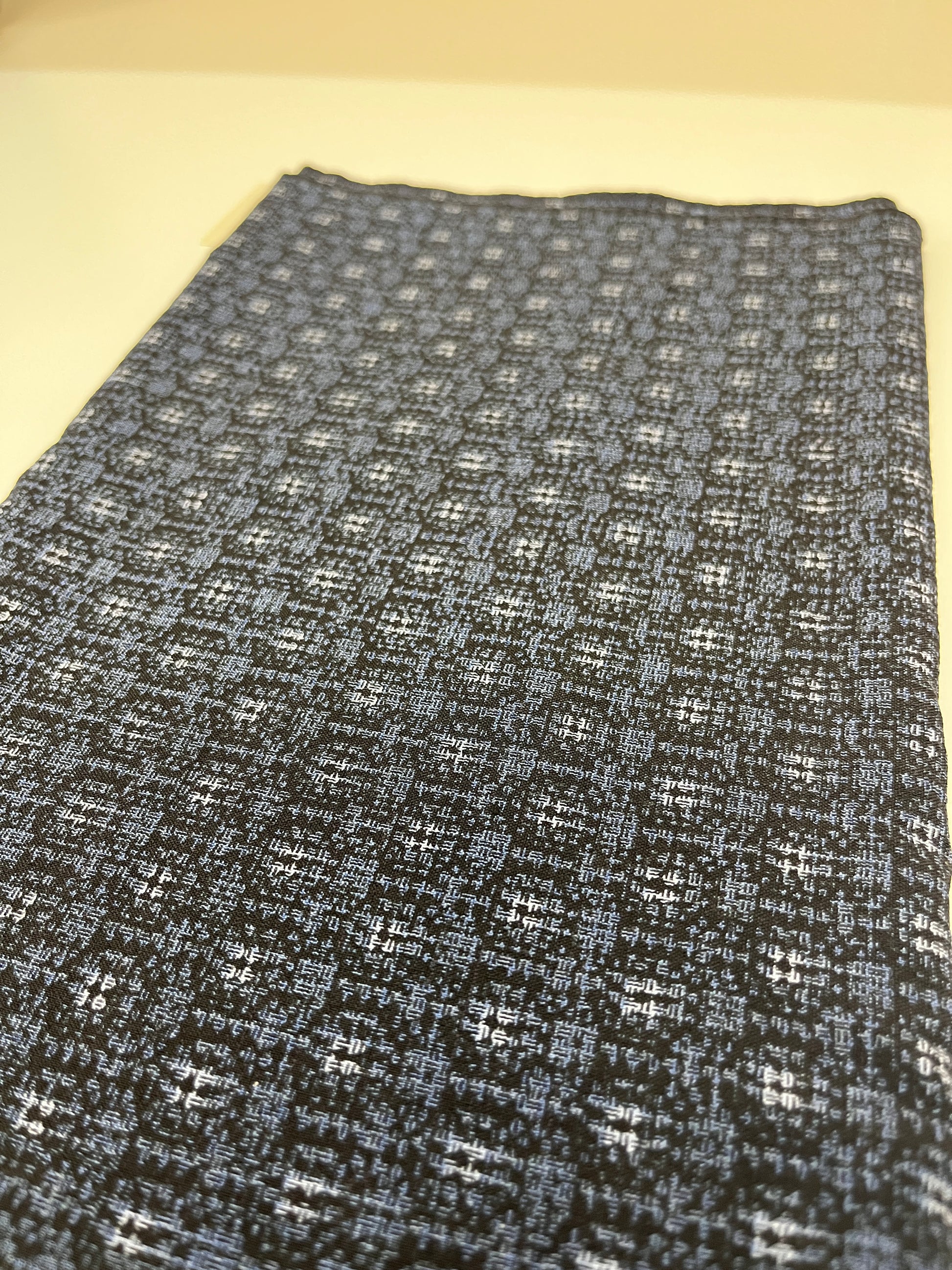 Kasuri is a woven fabric where threads are dyed before weaving, creating patterns with slight variations. It's a multipurpose cotton fabric that could be used to make accessories, homegoods, and casual kimono. This selection of fabric is somewhat sheer.